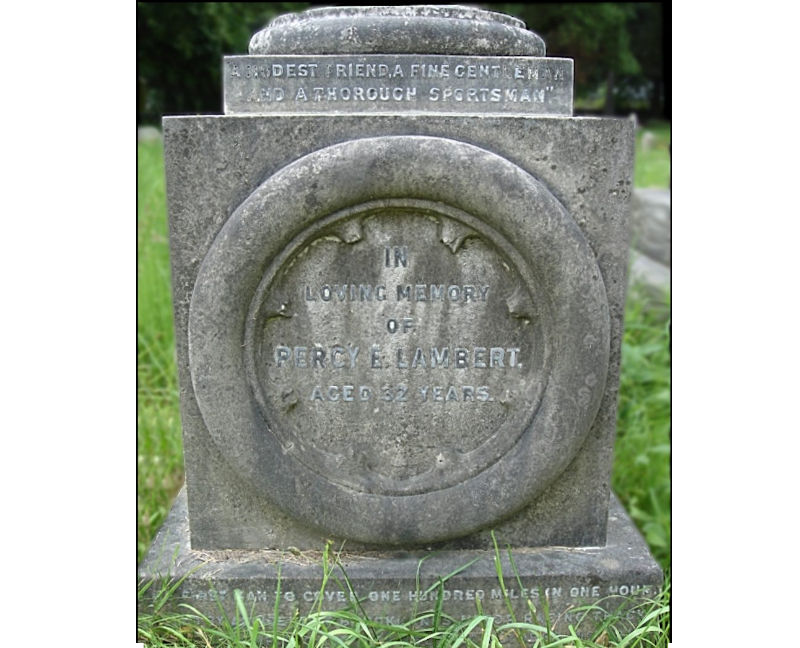 Very little is know about Percy's early life and the author would appreciate hearing from anyone who has information on this. We know he was born in 1881, the son of Charles and Sarah Lambert. He was survived by his brother and a sister Annie. He went to school and lived in the Westminster area between 1893-98. Later on, he worked with his older brother Harold Charles Lambert, in the motor trade. They sold Austin and later Singer cars, in Westminster. Below can be seen Percy getting ready for the record attempt, his gravestone and some of the Talbot advertising after the event.